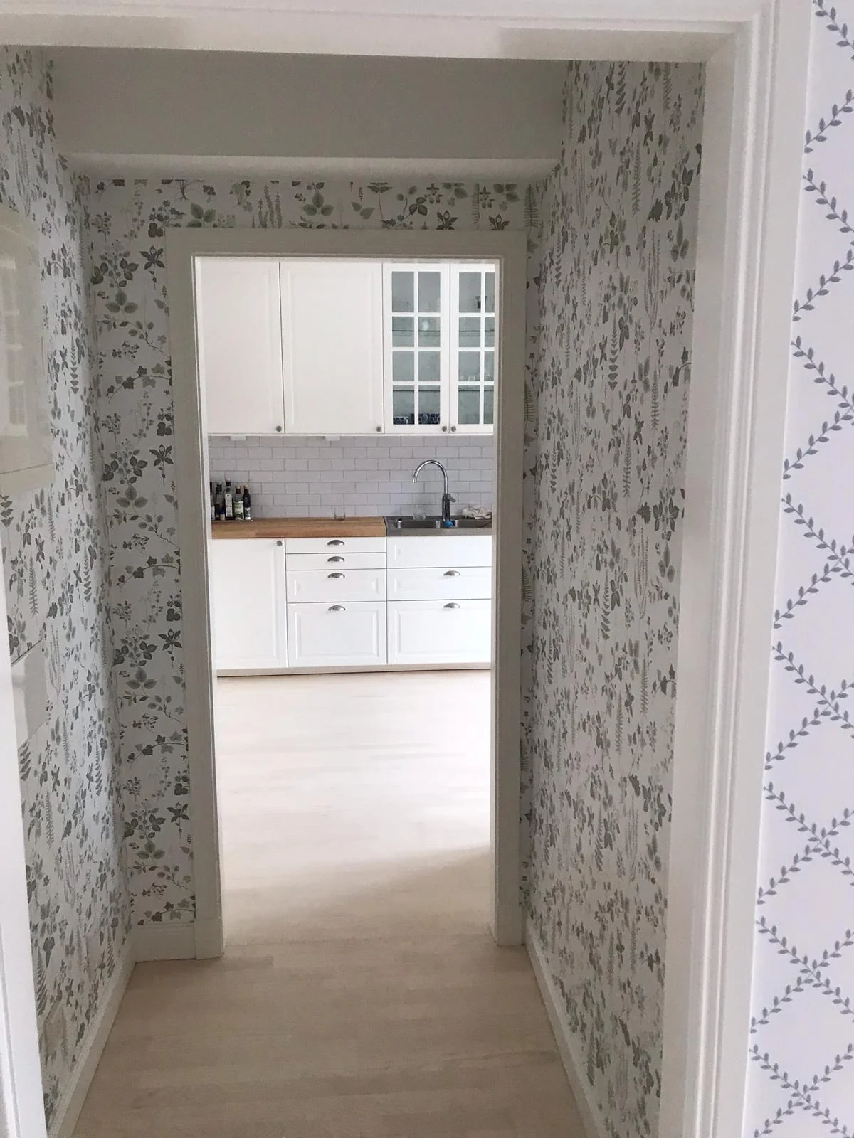 Tapetsering med mönsterpassning. Renoverat standard-parkett till vit-pigmenterat golv.